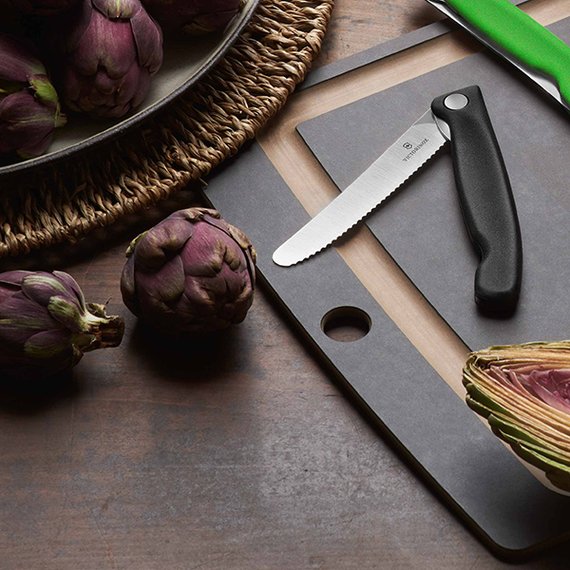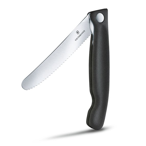 Legendaarisena pidetty sahalaitainen veitsi on saanut nousevaan retkeilytrendiin sopivan uuden muodon. Veitsi on taittuva sahalaitateräinen pikkujättiläinen, jolla leikkaat kaikki hedelmistä juureksiin ja jopa leipää. Terä lukkiintuu avonaisena, joten sillä on turvallista leikata. Taittuvan terän ansiosta veitsi menee pieneen tilaan, pysyy pakattuna suojassa ja pysyy pidempään terävänä. Terän pituus 11 cm. Veitsi on tarkoitettu kaikenlaisiin seikkailuihin, vaelluksiin, veneretkiin, asuntoautoon ja piknikille.Koko veitsen pituus avattuna 230 mm ja suljettuna 130 mm. Veitsi on konepesun kestävä. Yksittäispakkaus.