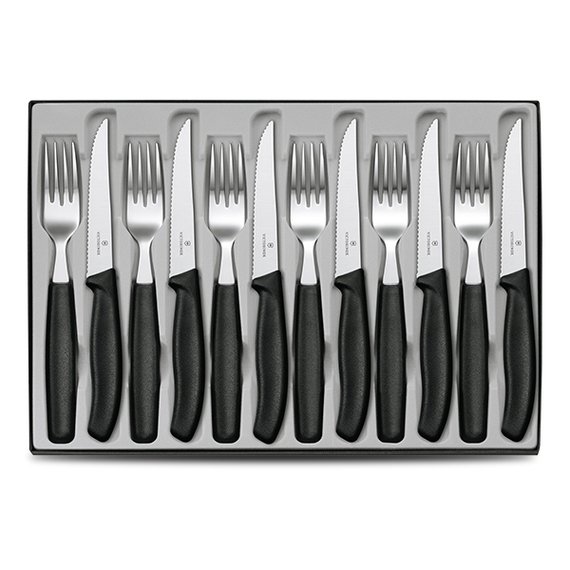 Victorinoxin korkealaatuinen ruokailuvälinesarja sisältää kuusi pihviveistä 11 cm terällä ja kuusi haarukkaa. Kahvamateriaali tuntuu miellyttävältä kädessä ja kestää konepesun. Kaikkein tärkein ominaisuus sarjassa on tietenkin pihviveitsien uskomattoman terävä ja pitkään terävyytensä säilyttävä sahalaitainen terä. Tämän sahalaitaisen terän valmistustekniikka on tarkoin varjeltu yrityssalaisuus ja kyseistä terää on monen valmistajan toimesta yritetty imitoida - useimmiten hyvin keskinkertaisin tuloksin. Tuote on valmistettu Sveitsissä korkeimmat mahdolliset ympäristönormit huomioiden.
