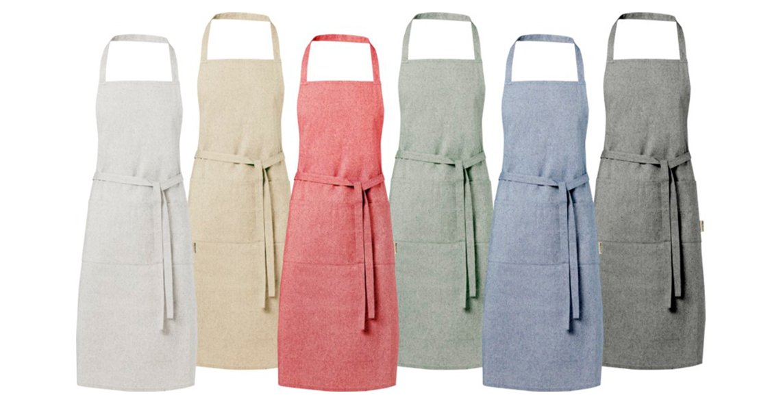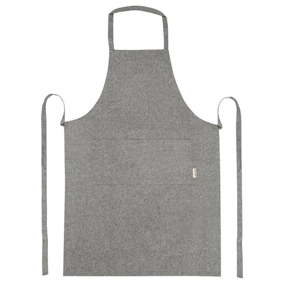 Siisti ja käytännöllinen kierrätetyistä materiaaleista valmistettu esiliina suojaa vaatteita keittiössä. Liinassa kaksi vierekkäistä taskua, joiden yhteiskoko on 45 x 20 cm ja metrin pituiset sidontanauhat. Valmistettu 80 % kierrätetystä puuvillasta ja 20 % kierrätetystä polyesteriseoksesta. 200 g/m². Mitat 70 x 100 cm. Saatavilla 6 eri värissä: meleerattu punainen, meleerattu sininen, meleerattu vihreä, meleerattu harmaa, meleerattu musta ja natural.