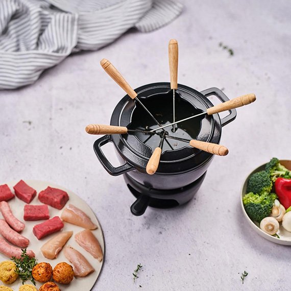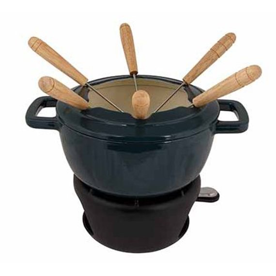 Fondue on paras seurusteluruoka. Kutsu ystävät viettämään iloista iltaa fonduepadan ympärille! Laadukkaasta ja kestävästä valuraudasta valmistettu fonduepata toimii juhlissasi todellisena katseenvangitsijana. Padan halkaisija on 18 cm. Setti sisältää padan lisäksi 6x ainutlaatuista haarukkaa puisella kahvalla sekä polttimen padan alle. Tuotteen käyttöiän pidentämiseksi suosittelemme käsinpesua.