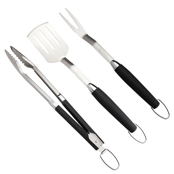 Kruunaa kesäkeittiösi ruostumattomasta teräksestä valmistetulla grillausvälinesetillä. Settiin kuuluu paistolasta, pihdit sekä haarukka. Pihdeissä on terävät hammastetut kärjet, joilla saat hyvän otteen kaikenlaisista grilliherkuista. Pihtien pituus on 43 cm, paistolastan 45 cm ja haarukan 46 cm. Kahvoissa on ripustusreiät.