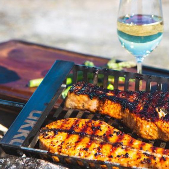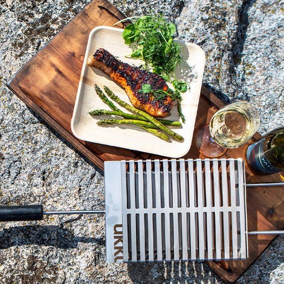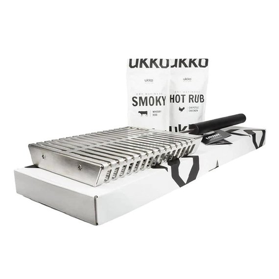 Roihu on mainio valinta avotuligrillaukseen. Etutappien ansiosta halsteri pysyy tukevasti paikallaan. Roihuun mahtuu muhkeammatkin fileet 40 mm sisäkorkeuden ansiosta. Piintyneet tahrat voit poistaa tiskiaineella ja tarvittaessa voit irroittaa puukahvan ruuvaamalla, jolloin halsteri on täysin konepestävä. Pakkauksen mukana saat Ukko Smoky ja Ukko Chipotle Rub pintamausteet.