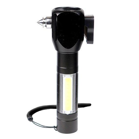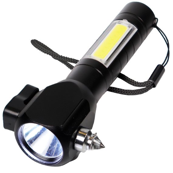 Ladattava taskulamppu, hätävasara, turvavyöleikkuri sekä magneettikiinnitys samassa paketissa. Hätävasaralla rikot hädän tullen vahvemmankin ikkunan. Alumiinisessa taskulampussa on valonlähde sekä lampun päässä (150 lumenia) että sen sivussa (120 lumenia). Päässä olevan valon saa myös vilkkumaan. Lampussa 550 mAh sisäänrakennettu akku. Max painoala 25 x 15 mm.
