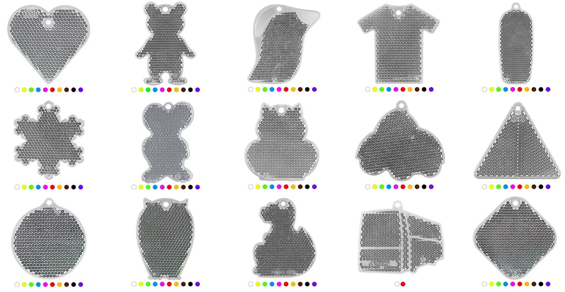 Heijastimet ovat saatavilla kahdessa hintaryhmässä. 1. hintaryhmään kuuluvat nalle, dino, pöllö, koira, suorakaide, lintu, kissa ja pyöreä. 2. hintaryhmään kuuluvat pullo, huomio, kolmio, bussi, sydän, auto, neliö, hiutale sekä T-paita.