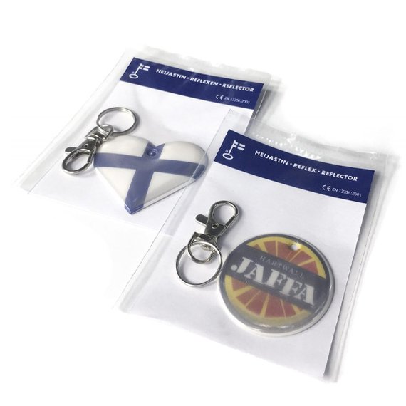 Iltojen hämärtyessä on tärkeää huolehtia omasta ja läheisten näkyvyydestä. Kotimaisella heijastimella varmistat näkyvyytesi kaupungin sykkeessä tai lenkkipoluilla. Hinnat sisältävät käyttöohjeen, saumapussin, painatuksen yhdelle puolelle aloituskuluineen sekä papukaijalukon palloketjulla. Kysy lisää saatavilla olevista muodoista. Heijastimella EN17353:2020 –sertifikaatti.