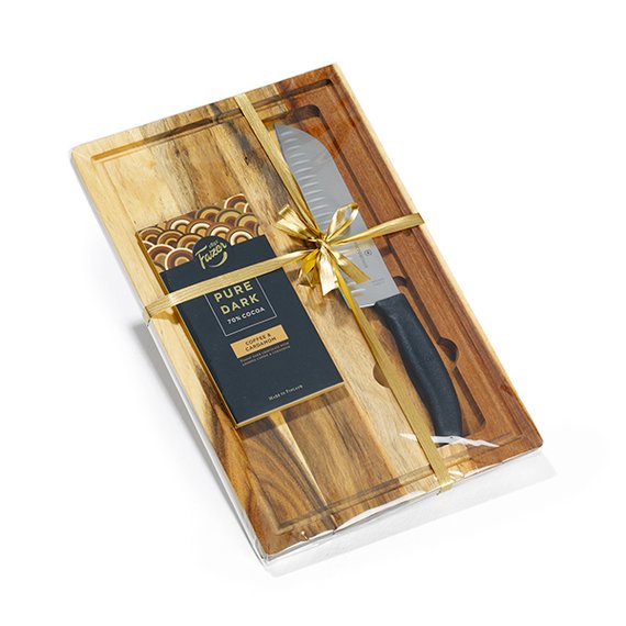 Hemmoteltu kokki Lahjasetin tuoteyhdistelmä ja lämmin värimaailma hurmaavat lahjansaajan heti ensivilkaisulla. Laadukas Santoku-veitsi lepää kauniin sävyisellä leikkuulaudalla. Fazerin Pure Dark 70 % Cocoa – Coffee & Cardamom hemmottelee jouluisten mausteiden, kahvin ja aidon tumman suklaan ystävää. Lahja on paketoitu sellofaaniin.
