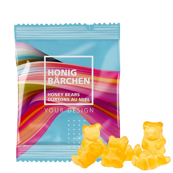 Hunajaiset XXL-nallekarkit ihastuttavat hunajaisella maullaan. Väri kasviuutteista, kukkahunajaa. Pakattu läpinäkyvään tai valkoiseen pussiin. Paino n. 20 g, koko 100 x 75 mm. Hinta sisältää 1-5-väripainatuksen ja aloituskulut. Minimitilausmäärä 600 kpl.