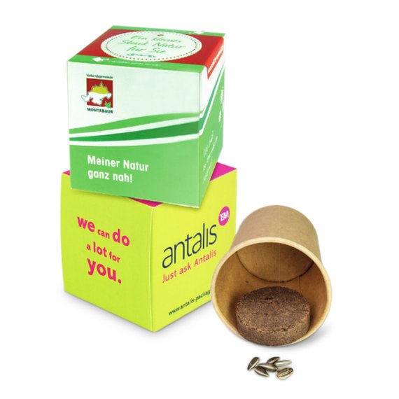 Istutettava paperikuppi, joka toimitetaan valitsemillasi siemenillä. Tuote sisältää paperikupin, kompostipelletin sekä siemenet. Koko 6,2 x 6,2 x 6,2 cm. Paino 22 g. Hinnat sisältävät digipainatuksen. Arvioitu toimitusaika n. 4-5 viikkoa. Saatavilla olevat siemenvaihtoehdot: Auringonkukka, kesäkukka, krassi, kehäkukka, yrttiseos, chili, ruoho, päivänkakkara, tuoksuapila, nelilehtiapila, basilika, kuusi, lemmikki, timjami ja meirami.