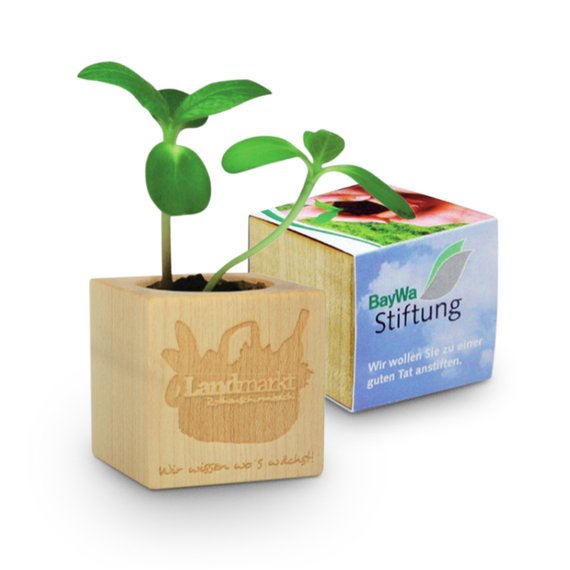 Pyökistä tai vaahterasta valmistettu istutuskuutio, joka toimitetaan valitsemillasi siemenillä (250 kpl). Tuote sisältää puisen ruukun, kompostipelletin sekä siemenet. Koko 4 x 4 x 4 cm. Paino 30 g. Hinnat sisältävät digipainetun vyötteen sekä laserkaiverruksen ruukkuun. Arvioitu toimitusaika n. 4-5 viikkoa. Saatavilla olevat siemenvaihtoehdot: Auringonkukka, kesäkukka, krassi, kehäkukka, yrttiseos, chili, ruoho, päivänkakkara, tuoksuapila, nelilehtiapila, basilika, kuusi, lemmikki, timjami ja meirami.