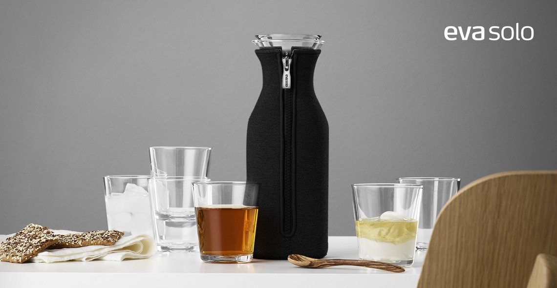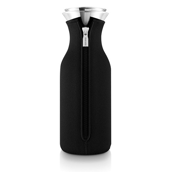 Eva Solon jääkaappikarahvi yhdistää perinteisen maitopullon muodon, pehmeän tekstiilin ja helppokäyttöisyyden. Ruostumattomasta teräksestä ja lasista valmistettu funktionaalinen kaunotar sujahtaa jääkaapin oveen. Juomaan on helppo lisätä hedelmiä tai jäitä karahvin leveästä suuaukosta. Automaattikorkki avautuu kaadettaessa ja sulkeutuu kun karahvin nostaa pystyyn. Juoma säilyy tuoreena jääkaapissa, hedelmät kaadettaessa karahvissa ja pöytäliina siistinä. Sekä karahvi että takki ovat konepestäviä. Toimitetaan lahjapakkauksessa.