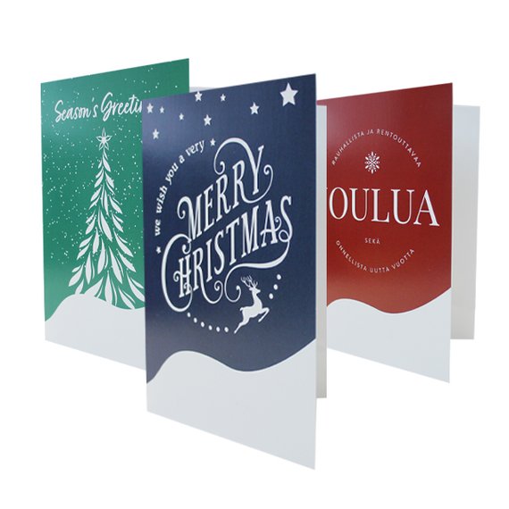 Nelisivuinen A6-kokoinen joulukortti omalla logolla ja tervehdyksellä. Viimeistele lahjasi kauniilla kortilla. Itse kirjoitettu tervehdys ilahduttaa ja lämmittää lahjan saajan mieltä. Kartonki 300 g/m2.