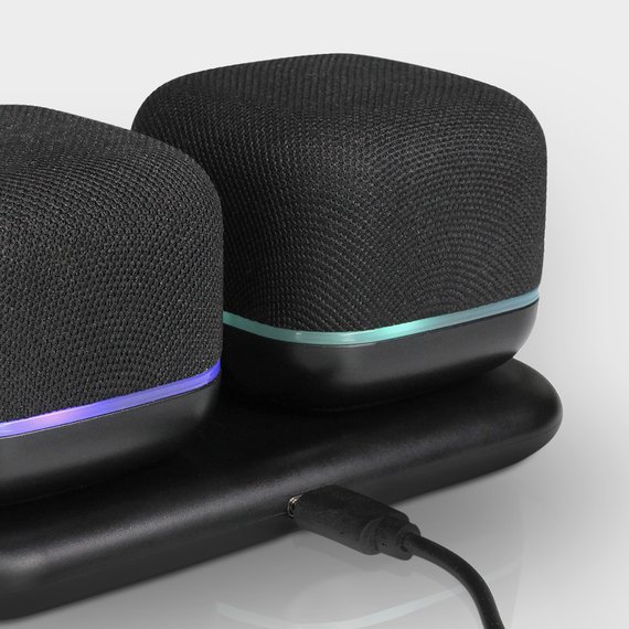 Leikkisä ja pienikokoinen kaiutin kotiin tai toimistolle. Lataa kaiuttimet täyteen latausalusta avulla ja aseta kaiuttimet vastakkain eri puolille huonetta. Cha-cha kaiuttimen langaton Bluetooth (versio 5.3) kantama riittää jopa 10 metriin ja täyteen ladattuna soittoaika on noin 1-1,5 tuntia. Uudelleenladattava 500 mAh akku latautuu täyteen 2 tunnissa. Mukana Type-C USB-latauskaapeli. Mitat 5,9 x 5,9 x 5 cm.