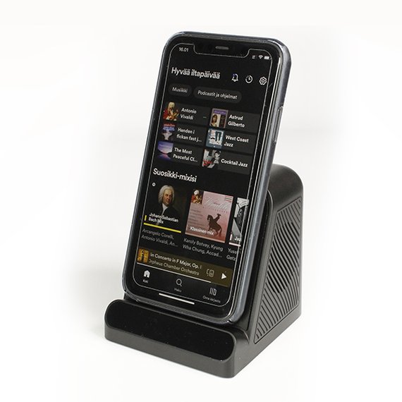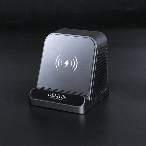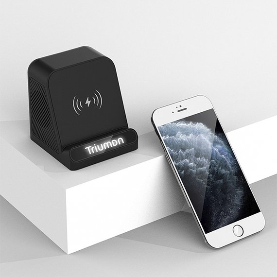 Kaiutin moneen tarkoitukseen! Kaiuttimeen on muotoiltu puhelimelle teline, jossa puhelimesi latautuu langattomasti samalla kun soitat lempimusiikkiasi. Yhdistät puhelimen helposti bluetoothilla (5.3). Pienen koon ansiosta kaiutin kulkee helposti mukana ja toimii langattomasti missä tahansa. Laseroi logosi eteen, joka hohtaa sisään rakennetun LED-valon ansiosta. Koko 96,5 x 84,5 x 92,8 cm.