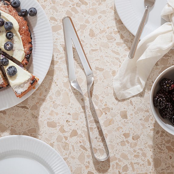 Upea Eva Solon kakkuotin viimeistelee juhlapöydän. Ruostumattomasta teräksestä valmistettu design kakkuotin on tehty näyttävästi yhdestä osasta. Kauniissa kakkuottimessa on leikkuureunat molemmilla puolilla. Kestää konepesun. Mitat 27,5 cm.