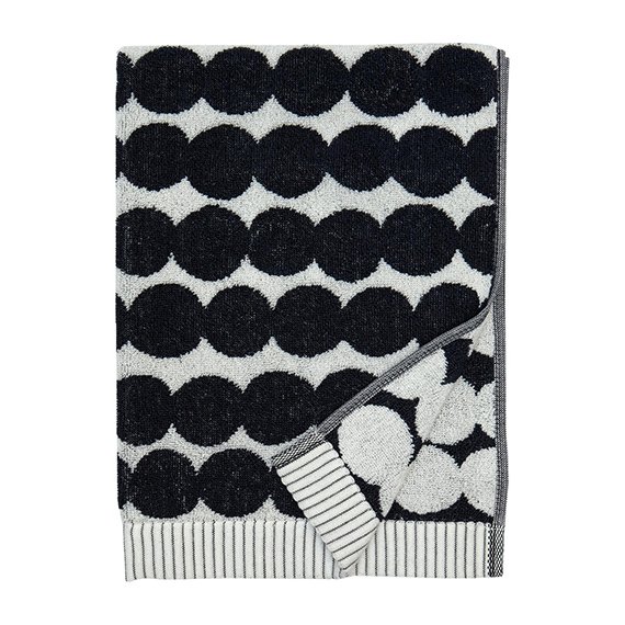 Luomupuuvillafroteesta valmistettu käsipyyhe Maija Louekarin suunnittelemalla Räsymatto-kuosilla. Oikean ja nurjan puolen värit ovat toistensa vastakohdat. Koko 50 x 70 cm.