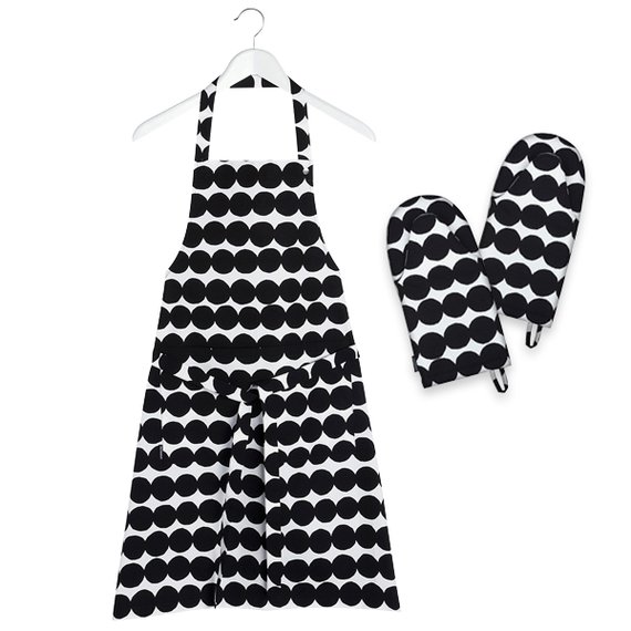 Räsymatto-keittiösetti sisältää kaksi uunikinnasta ja esiliinan. Paksusta puuvillasta valmistetussa molempikätisessä uunikintaassa on Räsymatto-kuosi, polyesteritäyte ja ripustuslenkki. Maksimi kosketuslämpötila tuotteelle on 250 Celsius-astetta. Esiliinassa on etutasku, kolmella painonapilla säädettävä niskanauha ja solmimisnauhat. Esiliinan pituus 85 cm, leveys 84 cm.
