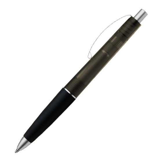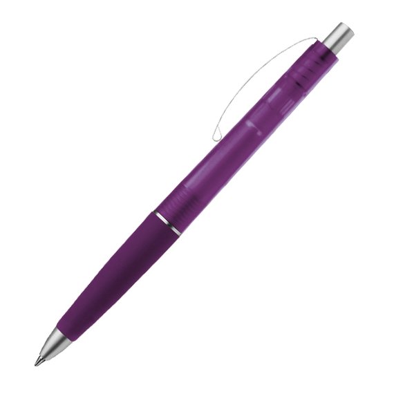 Huurrettu pintainen kuulakärkikynä, jossa kuminen pidinosa ja kaareva metalli klipsi. Kynässä on hopeiset yksityiskohdat ja sininen muste. Hinnat sisältävät 1-väripainatuksen kynään aloituskuluineen.