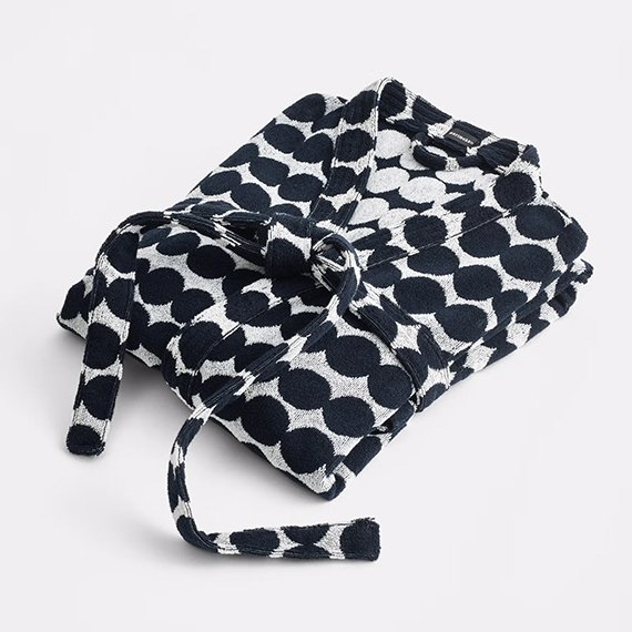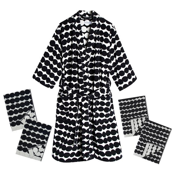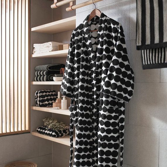 Räsymatto-kylpytakki on valmistettu pehmeästä 100 % puuvillafroteesta. Tätä paksua ja mukavaa puuvillafroteesta valmistettua kylpytakkia koristaa mustavalkoinen Räsymatto-kuosi. Kylpytakissa on suuret taskut edessä ja irrotettava vyö. Takin sisäpuoli on väriltään negatiivi ulkopuolesta, antaen kylpytakille hauskan ilmeen. Väri mustavalkoinen