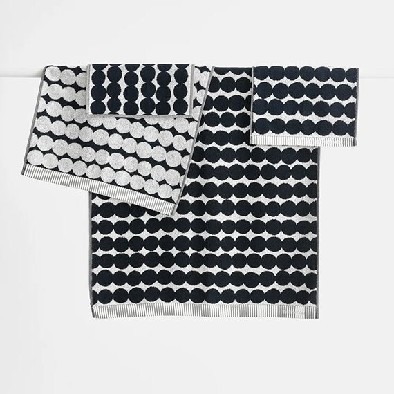 Pehmeät Räsymatto-pyyhkeet on valmistettu 100 % luomupuuvillafroteesta. Setti sisältää neljä pyyhettä: 2 x käsipyyhe koossa 50 x 70 cm ja 2 x kylpypyyhe koossa 150 x 75 cm. Pyyhkeiden väri on mustavalkoinen.