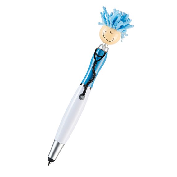 Leveästi hymyilevä MopToppers-kynä nyt uudessa hahmossa! Kynä kirjoittaa napakasti ja piristää työpöytää. Kynähahmon mikrokuituhiuksilla voit puhdistaa nopeasti esimerkiksi puhelimen tai tabletin näytön. Kynän kärjessä on näppärä kosketusnäyttöpää.