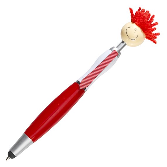 Leveästi hymyilevä MopToppers-kynä kirjoittaa napakasti ja piristää työpöytää. Kynähahmon mikrokuituhiuksilla voit puhdistaa nopeasti esimerkiksi puhelimen tai tabletin näytön. Kynän kärjessä on näppärä kosketusnäyttöpää.