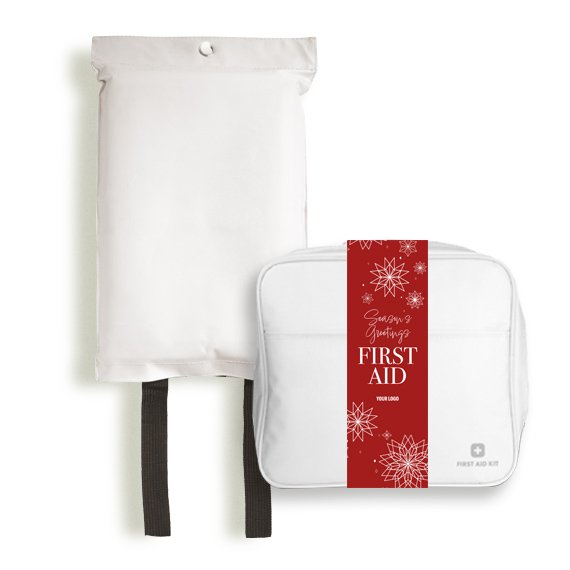 Kodin turvasetti sisältää tyylikkään valkoisen sammutuspeitteen ja näppärän Family-ensiapulaukun. Tuotteiden valkoinen väri tarjoaa brändillesi laajan painoalan.