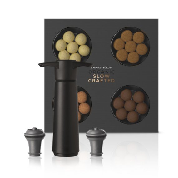 Hienostuneet luomulakritsit ja kätevä Vacu Vin viinipumppu ja 2 korkkia muodostavat tämän lahjasetin. Laatikko sisältää neljä eri makua. Tanskassa valmistettuja ja gluteenittomia. Täydellinen lahja nautiskelijoille!
