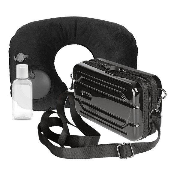 Täydellinen setti matkustajalle. Aseta matkatyyny niskaan ja nauti matkustamisesta huolettomasti ilman niskakipuja. Pidä hygieniasta huolta 50 ml käsigeelin avulla ja pakkaa se matka koteloon muiden pientarvikkeiden ja elektroniikan kanssa.