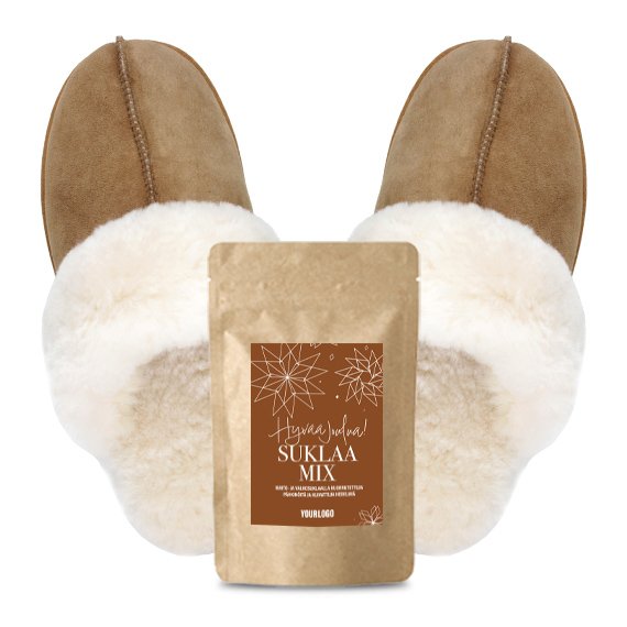 Lahjasetti sisältää pehmeät lampaan villasta valmistetut slip-on -sisätohvelit sekä herkullisen suklaamixin, joka yhdistää suklaapäällysteiset pähkinät, rusinat ja kuivatut banaanit. Suklaamix pakataan tyylikkääseen paperipussiin, joka kustomoidaan omalla etiketillä.