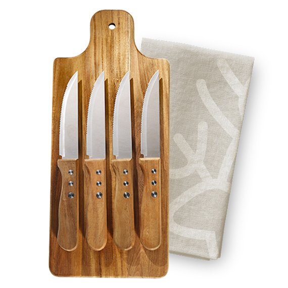 Lahjasetti sisältää neljä laadukasta pihviveistä tyylikkäällä leikkuulaudalla sekä porokuvioidun keittiöpyyhkeen. Täydellinen valinta grillaukseen ja herkutteluhetkiin, joissa laatu ja pohjoinen tunnelma kohtaavat.
