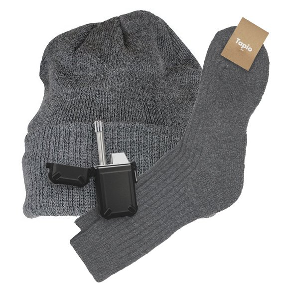 Täydellinen setti vaeltajalle! Suojaa pää ja jalat akryylistä valmistetuilla pipolla ja sukilla ja sytytä nuotio tehokkaalla elektronisella plasmasytyttimellä.