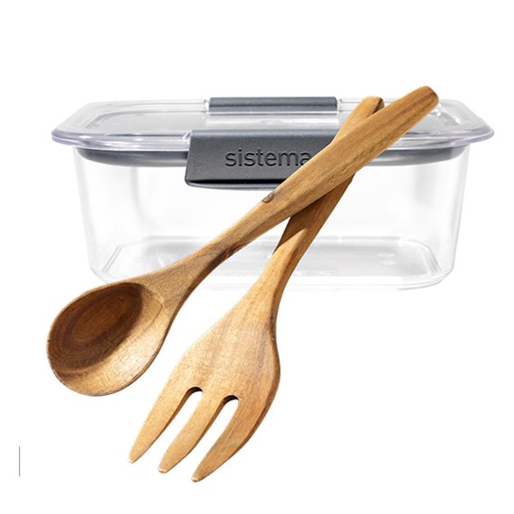 Lahjasetissä on kaksi kestävää tuotetta: Sistemaeväsrasia ja puiset salaatinottimet. Nämä tekevät arjen ruoankäsittelystä helpomman ja ruokahävikin pienentämisessä auttaa ilma- ja vesitiivis Sistemarasia. Valmista makoisa salaatti illalliselle ja pakkaa loput rasiaan talteen