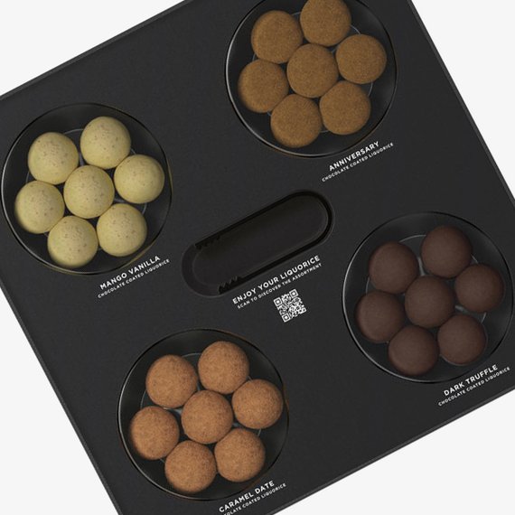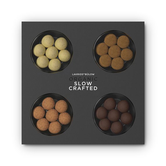 Slow crafted selection box on ihanteellinen, kun haluat antaa lahjaksi tyylikkään sekoituksen hienostuneita luomumakeisia. Sekoitus sisältää neljää eri makua: Mango vanilla, Caramel date, Dark truffle ja Anniversary. Lakritsit valmistetaan Tanskassa gluteenittomasta riisijauhosta.