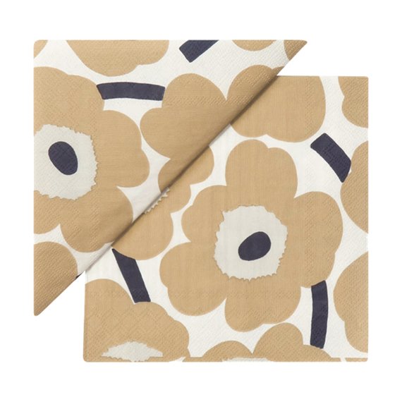 Näyttävät Marimekon Unikko lautasliinat vaaleanruskeassa hiekan värissä. Klassisen kuosin suunnitteli Maija Isola vuonna 1964. Kotimaiset lautasliinat ovat Havin valmistamat ja ne ovat painettu Imatralla 3-kertaiselle pehmopaperille. Lautasliinoille on myönnetty Avainlippu, Joutsenmerkki ja FSC.