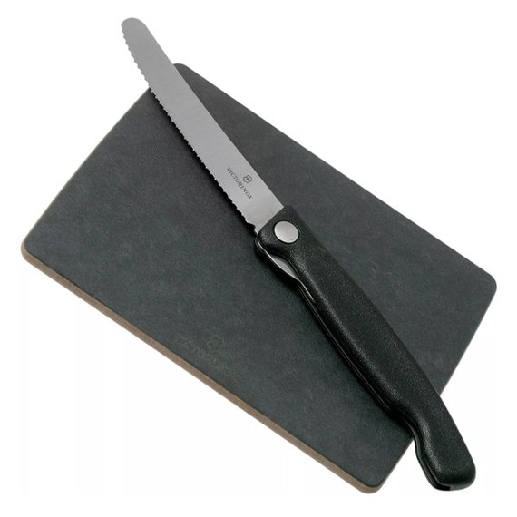 Sveitsiläinen klassikko. Setti, jossa kokoontaitettava hedelmäveitsi ja leikkuulauta. Terä taittuu kahvan sisään, jolloin se pysyy hyvässä kunnossa, eikä aiheuta vahinkoa. Musta polypropeenista tehty kahva. Terän pituus on 11 cm ja siinä on aaltomainen reuna. Veitsi on konepesun kestävä. Leikkuulauta on ympäristöystävällinen, eikä se vahingoita terää. Leikkuulaudan koko 16,8 x 12,2 x 0,6 cm. Laudan ja veitsen yhteispaino 186 g.
