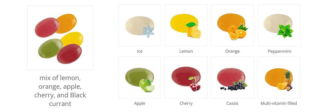 Ainesosat: sokeri, glukoosisiirappi, sitruunahappo, aromit, kasviuutteet (kurkuma, paprika, musta porkkana, spirulina, väriohdake), hedelmämehutiiviste (mustikka, omena, appelsiini, aprikoosi, persikka, kiivi, kirsikka, karhunvatukka, vadelma, mustaherukka, sitruuna, mansikka, lime).