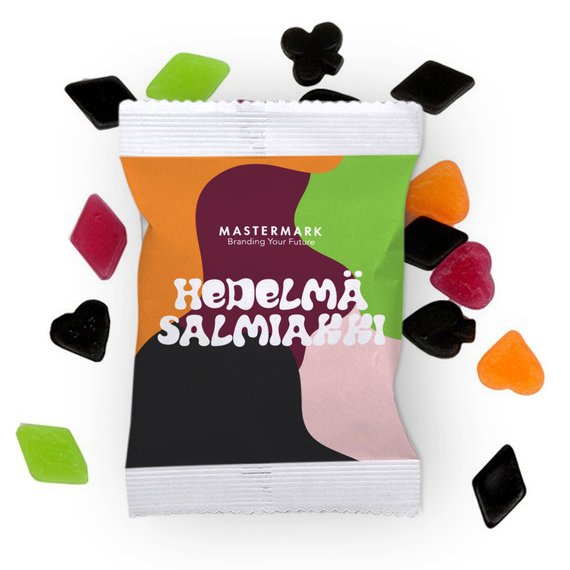 110 x 75 mm mainospussissa yhdistyy raikkaat hedelmämaut sekä suolaisen makea salmiakkilakritsi. Tuote on vegaaninen. Karkkipussi viimeistellään halutulla painatuksella. Tuotteiden paino- ja pakkaustyö ovat suomalaista työtä. Koko n. 30 g. Parasta ennen -aika on toimituksesta n. 6-8kk. Minimitilausmäärä 400 kpl. Hinnat sisältävät painoaineistojen teon.