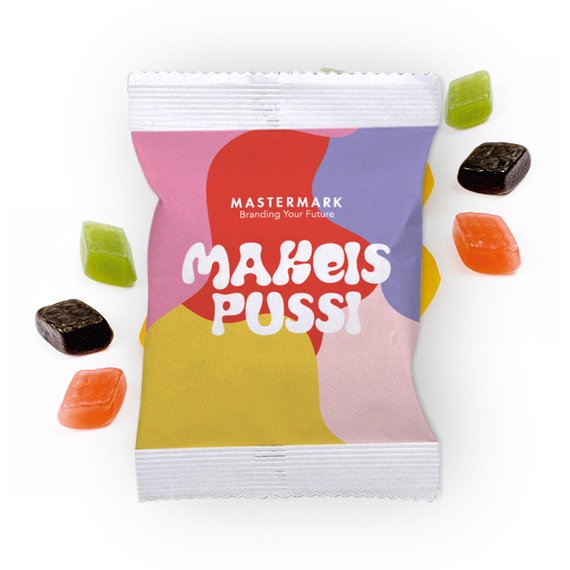Herkullinen hedelmä- ja salmiakkiruutu omalla aineistolla. Paino 5 g (noin 7-8 kpl), pussin koko 70x70 mm. Huom! Ruutukarkit eivät ole tasakokoisia. Minimitilausmäärä 100 kpl. Hintaan sisältyy yksilöity 4-väripainatus tuotteen molemmin puolin, ainesosaluettelo ja valmistuttaja painetaan pussin taakse. Säilyvyysaika 12 kk.