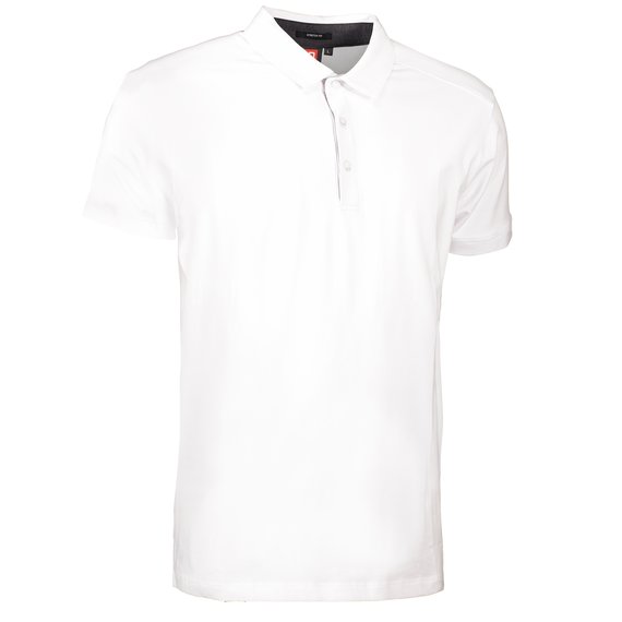 Business, single jersey stretch polo shirt with stylish collar stand. Sleeves are finished with a firm cuff made of the same material. Elegant contrast fabric inside on collar stand and front placket. Button closure with attractive two-tone matching buttons. Small elegant slit in side seam. Stretch quality is light and soft and offers greater comfort and freedom of movement.