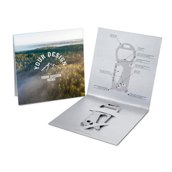 Pieni ja kompakti monitoimityökalu, joka on valmistettu korkealaatuisesta mattapintaisesta ruostumattomasta teräksestä. Tarpeellinen kumppani, joka sopii jokaisen avainnippuun. Yhteensä 16 eri toimintoa: kannennostin, pieni ja iso litteäkärkinen ruuvimeisseli, ristipääruuvimeisseli, kaapelinpoistaja, kaksi puoliavainta, seitsemän kuusikulmaista kantaa, viivain ja naulanvedin. Hinnat sisältävät logokaiverruksen työkaluun sekä pakkauksen omalla designilla.