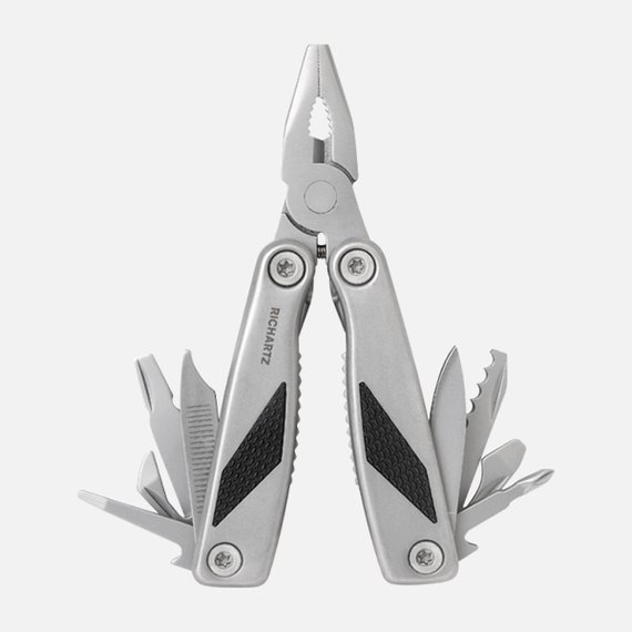 Monitoimityökalu 12 eri toiminnolla: valupihdit, lankaleikkurit, viila, tölkin- ja pullonavaaja, 4 erilaista ruuvimeisseliä ja 3 erilaista terää. Mitat 68 x 34 x 17 mm.