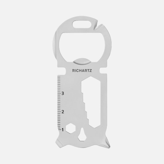 Monitoimityökalu 16 eri toiminnolla: kaapelin kuorija, korkinnostin, 2 puoliavainta, 3 ruuvimeisseli, viivain, naulojen irrotin ja 7 erilaista kuusikulmainkantaa. Mitat 70 x 31 x 2 mm.