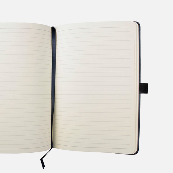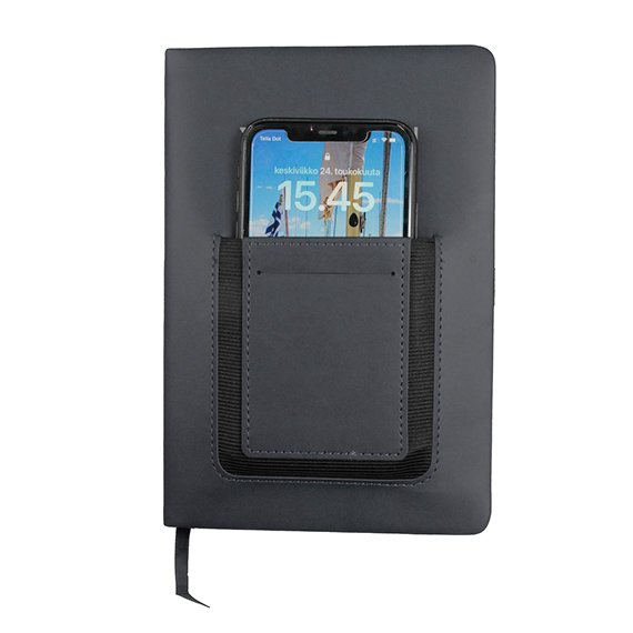 Tyynymäinen PU-kantinen 14,5 x 21 cm kokoinen muistikirja joustavalla etutaskulla. Muistikirjassa 80 sivun verran valmiiksi viivoitettua tilaa muistiinpanoille, pyöristetyt kulmat sekä kirjanmerkki. Paperi 80 g/m². Materiaali kierrätetty PU, paperi FSC-sertifioitua.