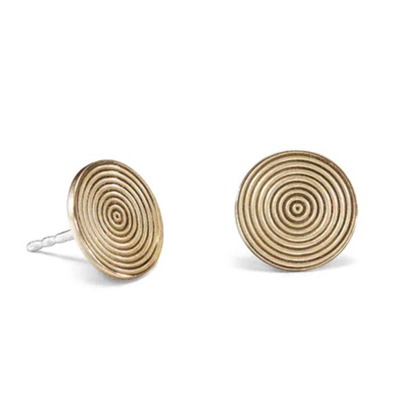 Pienet pyöreät Kosmos-nappikorvakorut on valmistettu kullanhohtoisesta kirkkaasta pronssista. Pelkistetyt konstailemattomat korvakorut on helppo yhdistää kaikenlaisiin koruihin. Tappikiinnitys, tappi ja taustanasta hopeaa.