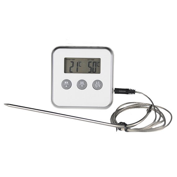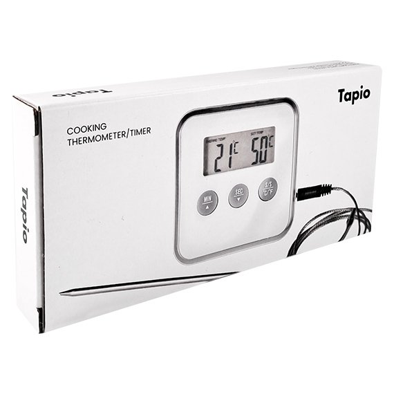 Digitaalinen paistomittari ajastimella on täydellinen kumppani lihan, kalan ja leivonnaisten valmistuksessa. Mittarin takana tukijalka. Ruostumattomasta teräksestä valmistettu anturi metallijohdolla. Johdon kokonaispituus 120 cm. Lämpöasteikko max. 250 °C / 482 °F. Ajastin max. 99 min 59 sec. Mitat 80 x 80 x 13,5 cm. Tuote sisältää 1 x AAA pariston.