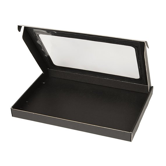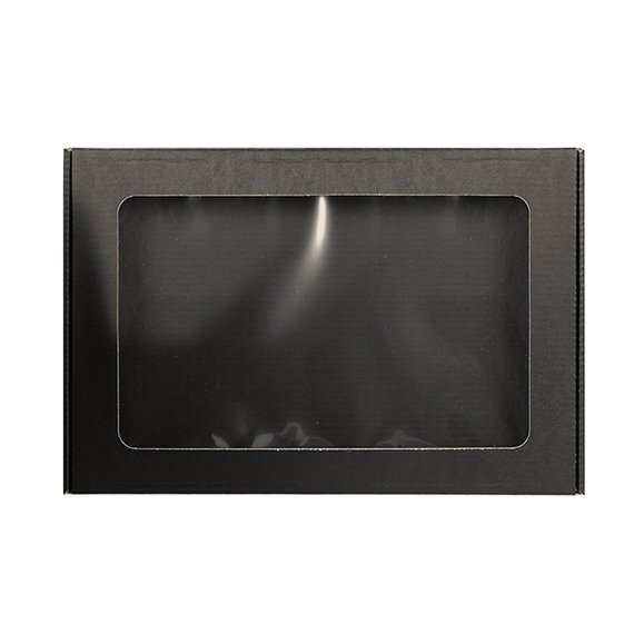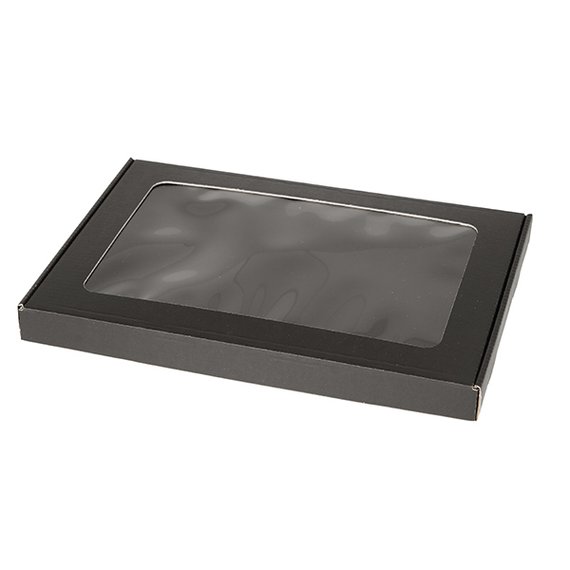 Matta musta pakkaus ikkunalla. Mitat 270 x 184 x 22 mm.