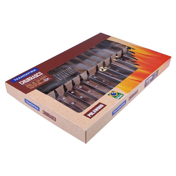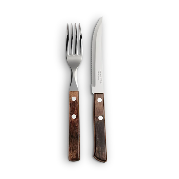 Tyylikkäät aterimet tuovat tunnelmaa niin arkeen kuin juhlakattaukseenkin. Tramontina Churrasco -setti sisältää 6 kpl haarukoita ja 6 kpl sahateräisiä pihvi-/pizzaveitsiä, jotka voi puukahvasta huolimatta pestä astianpesukoneessa. Kahvassa käytettävä Polywood on komposiittimateriaali, joka koostuu puuviiluista ja hartsista. Viilut pinotaan päällekkäin ja kyllästetään hartsilla, jonka jälkeen ne puristetaan tiiviisti yhteen ja hartsi kovetetaan lämmittämällä. Tällä menetelmällä puun luonnollinen ulkonäkö pystytään säilyttämään samalla kun jokainen viilu peitetään polymeerimateriaalilla, joka suojaa puuta kosteudelta ja mikrobeilta, ja tekee tuotteesta konepesun kestävän. Polywood-materiaali valmistetaan FSC-sertifioidusta männystä, metalliosat ovat ruostumatonta terästä. Rajoitettu takuu 5 vuotta.