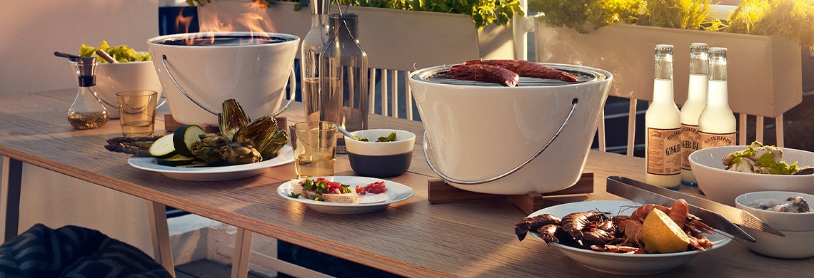 Eva Solon pöytägrillin avulla kesäiset illanistujaiset nousevat aivan uudelle tasolle. Yksinkertaisen tyylikäs pöytägrilli on kattauksen keskipiste, jonka ritilällä vieraasi voivat grillata pientä naposteltavaa pöydästä nousematta. Pöytägrilli soveltuu mainiosti vaikkapa pienen seurueen tapas-iltoihin ja kätevän kantokahvan ansiosta se on helppo ottaa mukaan myös puistoon tai rantapiknikille. Tuote koostuu valkoisesta posliinikulhosta, pohjan lämpösuojasta, hiiliastiasta telineineen, paistoritilästä ja tukevasta puualustasta. Kaikki osat puualustaa lukuun ottamatta voidaan pestä astianpesukoneessa.