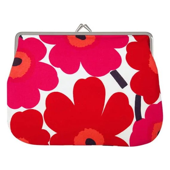 Marimekon Unikko -kukkaroa koristaa Maija Isolan suunnittelema ikoninen kukkakuosi. Puolikas-kukkaro on tilava ja monikäyttöinen pussukka niin meikki- ja hygieniatuotteiden, toimistotarvikkeiden kuin kaikenlaisten pikkutavaroiden säilytykseen. Unikko -kukkarossa on napsauttamalla avautuva metallinen kehys, ja sen lujatekoinen puuvillakangas on painettu Helsingissä. Konepesun kestävä. Mitat 14 x 20 cm. Valmistettu 100 % luomupuuvillasta.