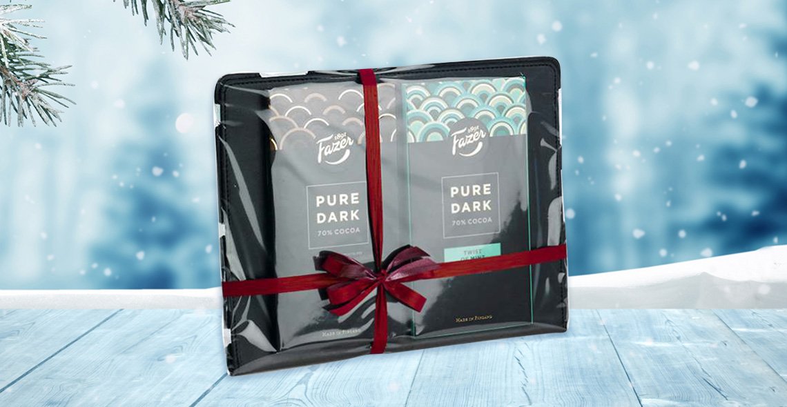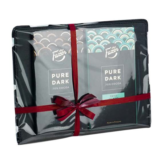 Syviä makuja ja selkeitä linjoja. Fiksun iPad-kansion päällä lepää kaksi ihanaa Fazer Pure Dark 70 % Cocoa suklaalevyä. Lahja on paketoitu sellofaaniin.
